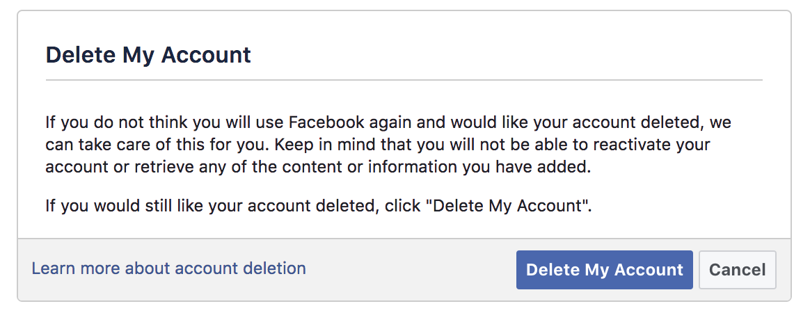 Facebook notes it takes a few days to complete deletion after you request it, and if you log back into Facebook during that time, you’ll cancel the deletion request.